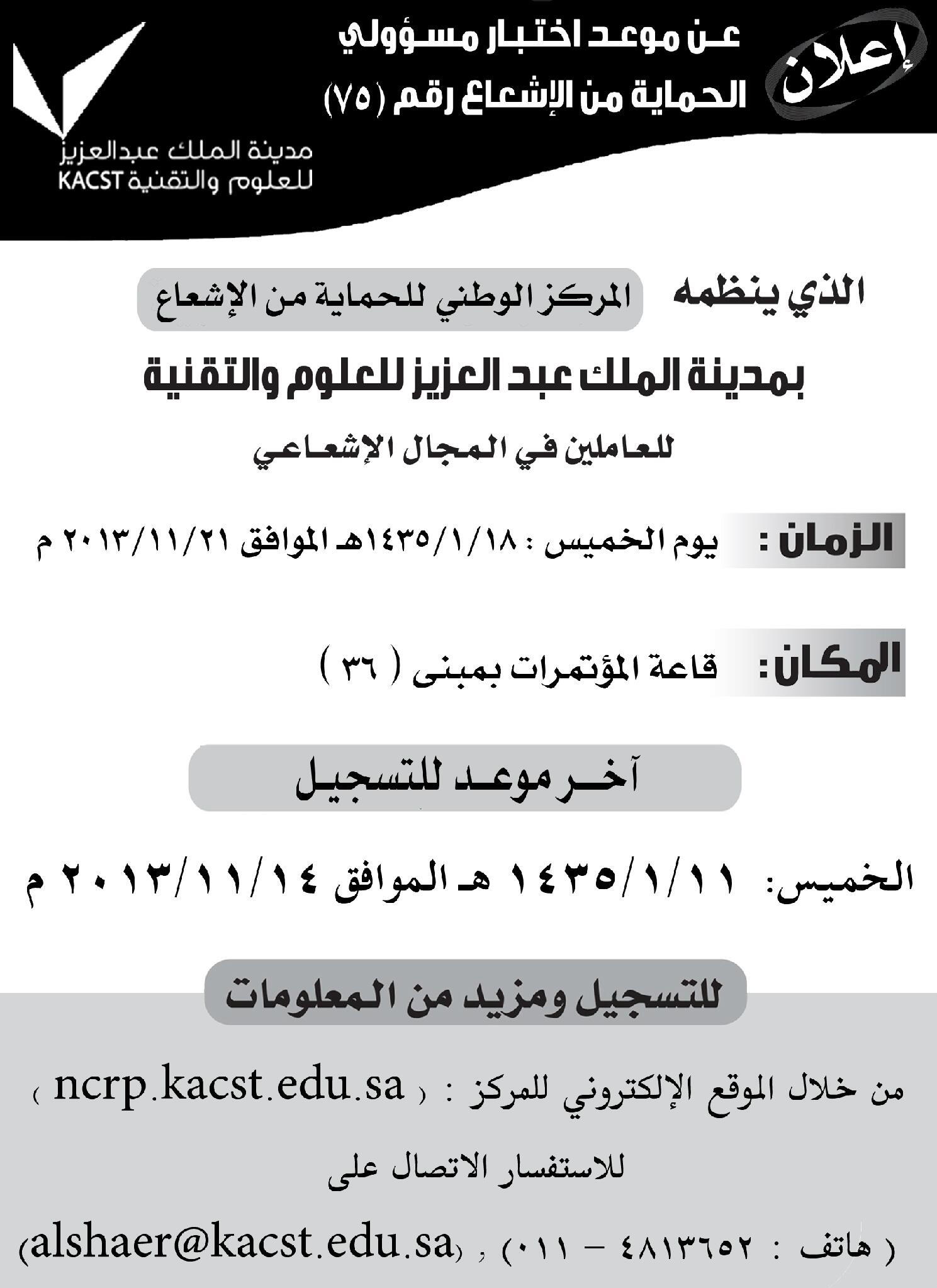 مـ د يـ نـة الملك عبدالعزيز للعلوم والتقنية Auf Twitter المركز الوطني للحماية من الإشعاع يعلن عن موعد اختبار مسؤولي الحماية من الإشعاع رقم 75 Http T Co 6evxefa5vm
