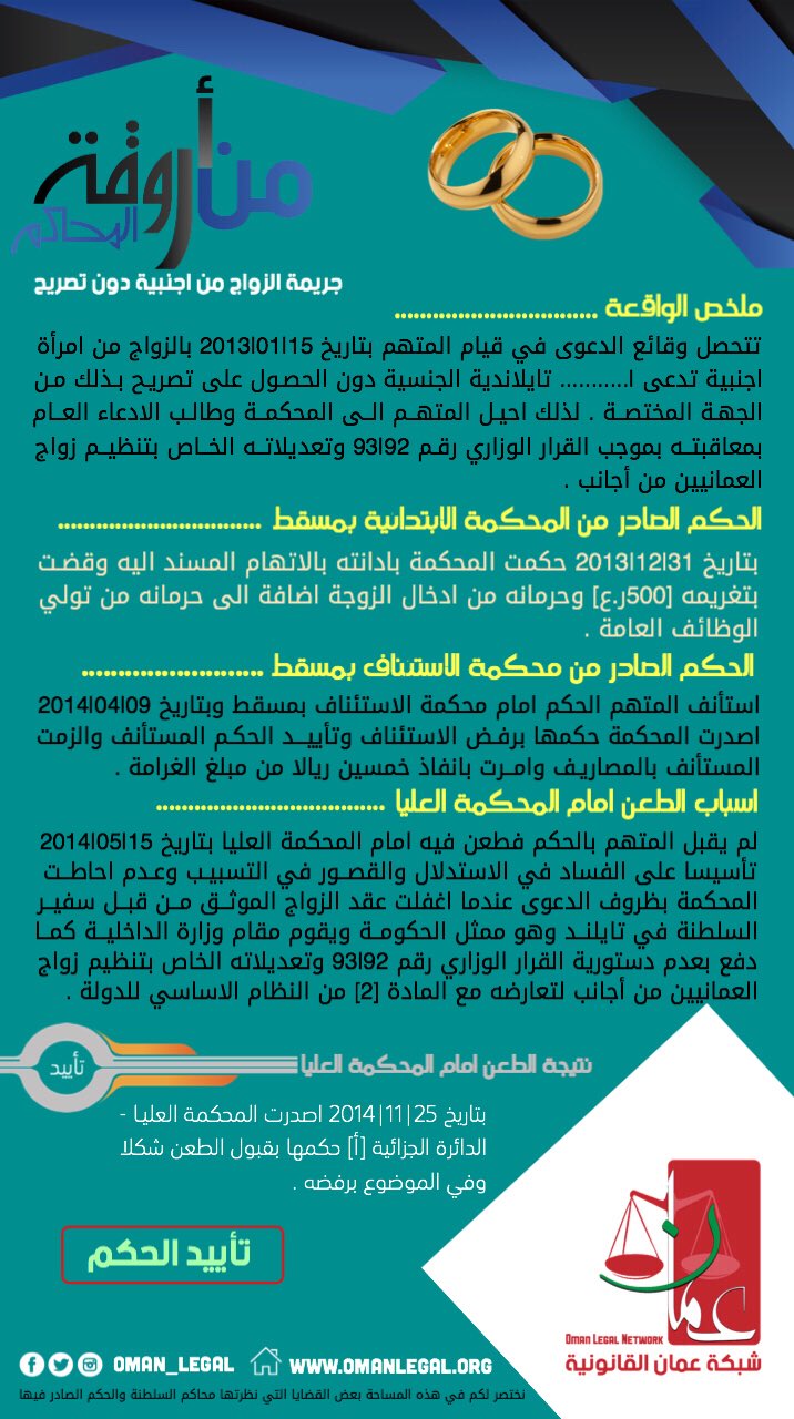 شبكة عمان القانونية En Twitter تزوج من أجنبيه دون أن يحصل على تصريح من وزارة الداخلية بحسب المقرر قانونا متجاهلا القيود المفروضه على الزواج من أجنبيه وبعد احالته الى