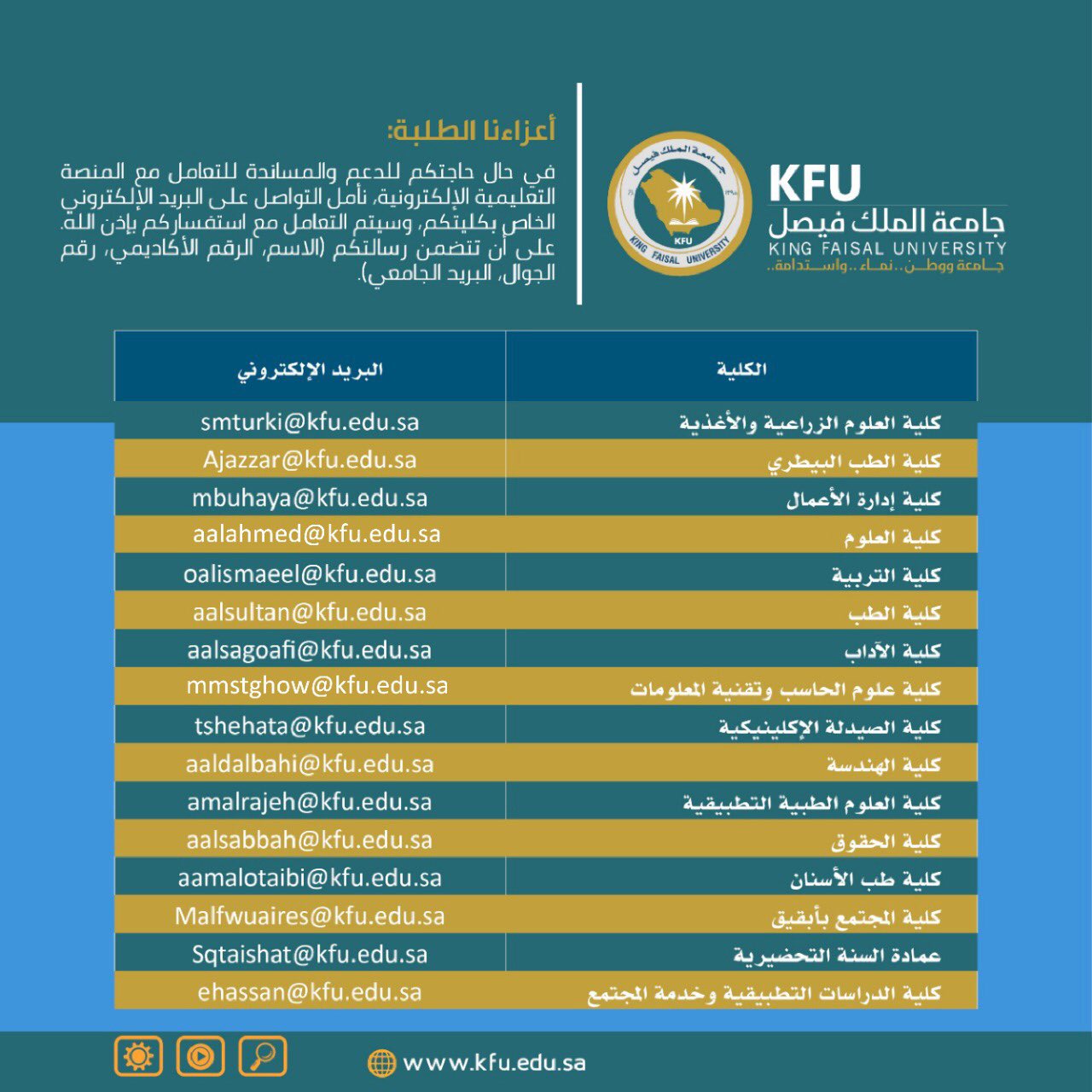 جامعة الملك فيصل On Twitter أعزاءنا الطلبة في حال حاجتكم للدعم والمساندة للتعامل مع المنصة التعليمية الإلكترونية نأمل التواصل على البريد الإلكتروني الخاص بكليتكم وسيتم التعامل مع استفساركم بإذن الله على أن