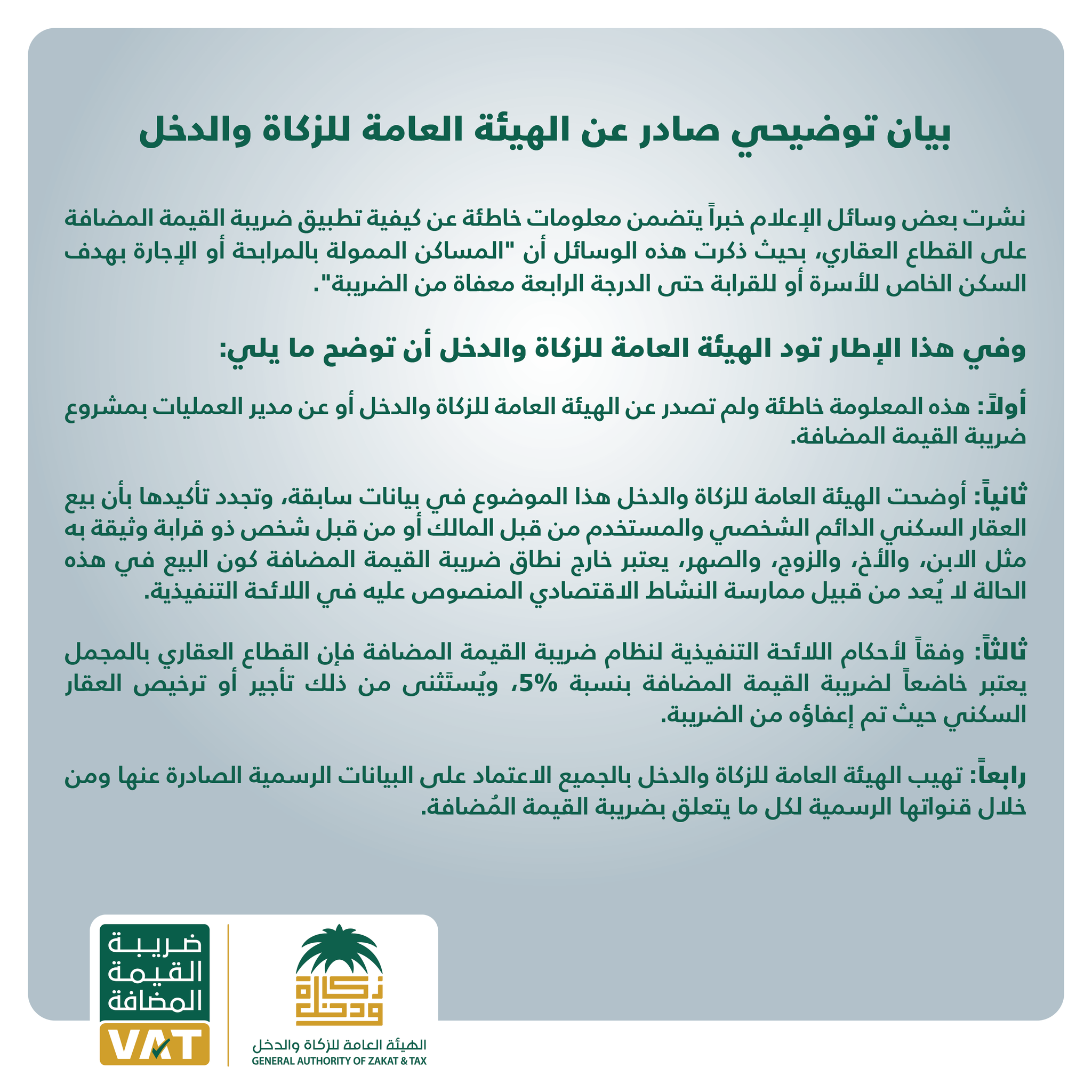 ضريبة القيمة المضافة في السعودية وسوق العقارات يتم تطبيق ضريبة القيمة المضافة التي تم إدخالها مؤخرا في المملكة العربية السعودية على أي صفقة عقارية في المملكة. ونظمت الهيئة العامة للزكاة والدخل في مقرها بالرياض ورشة عمل عن ضريبة القيمة المضافة للشركات العقارية العاملة في السعودية في إطار ما تنفذه الهيئة من خطط وبرامج توعوية للمنشآت من مختلف.