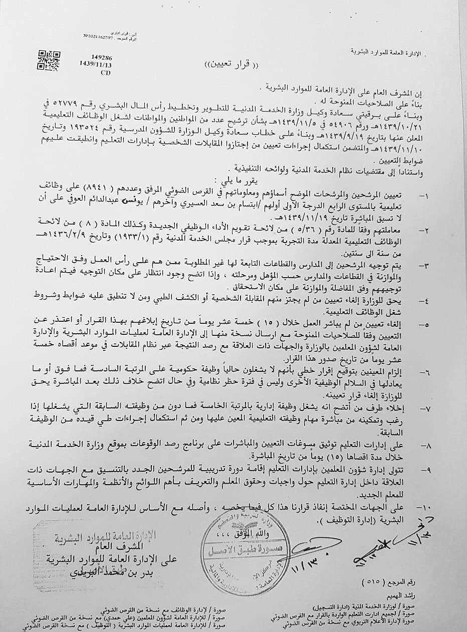 محمد الزارع Na Twitterze هذه نسخة من قرار تعيين المعلمين والمعلمات الصادر في 13 11 1439 بعدد 8941 معلم ومعلمة على المستوى الرابع و قرار تعيين عدد 58 محضر مختبر على المستوى الثاني