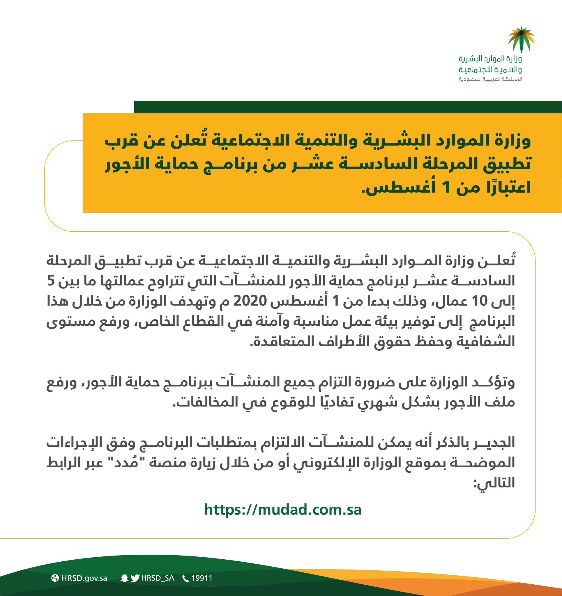 نظام العمل السعودي On Twitter اعتبار ا من 1 أغسطس وزارة الموارد ت طبق المرحلة 16 من برنامج حماية الأجور للمنشآت التي تتراوح عمالتها مابين 5 إلى 10 عمال وذلك لتوفير بيئة آمنة في