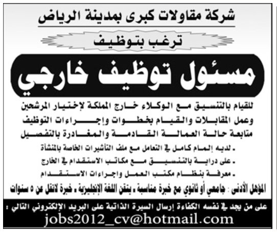 وظيفة مسؤول توظيف خارجي في شركة مقاولات في الرياض